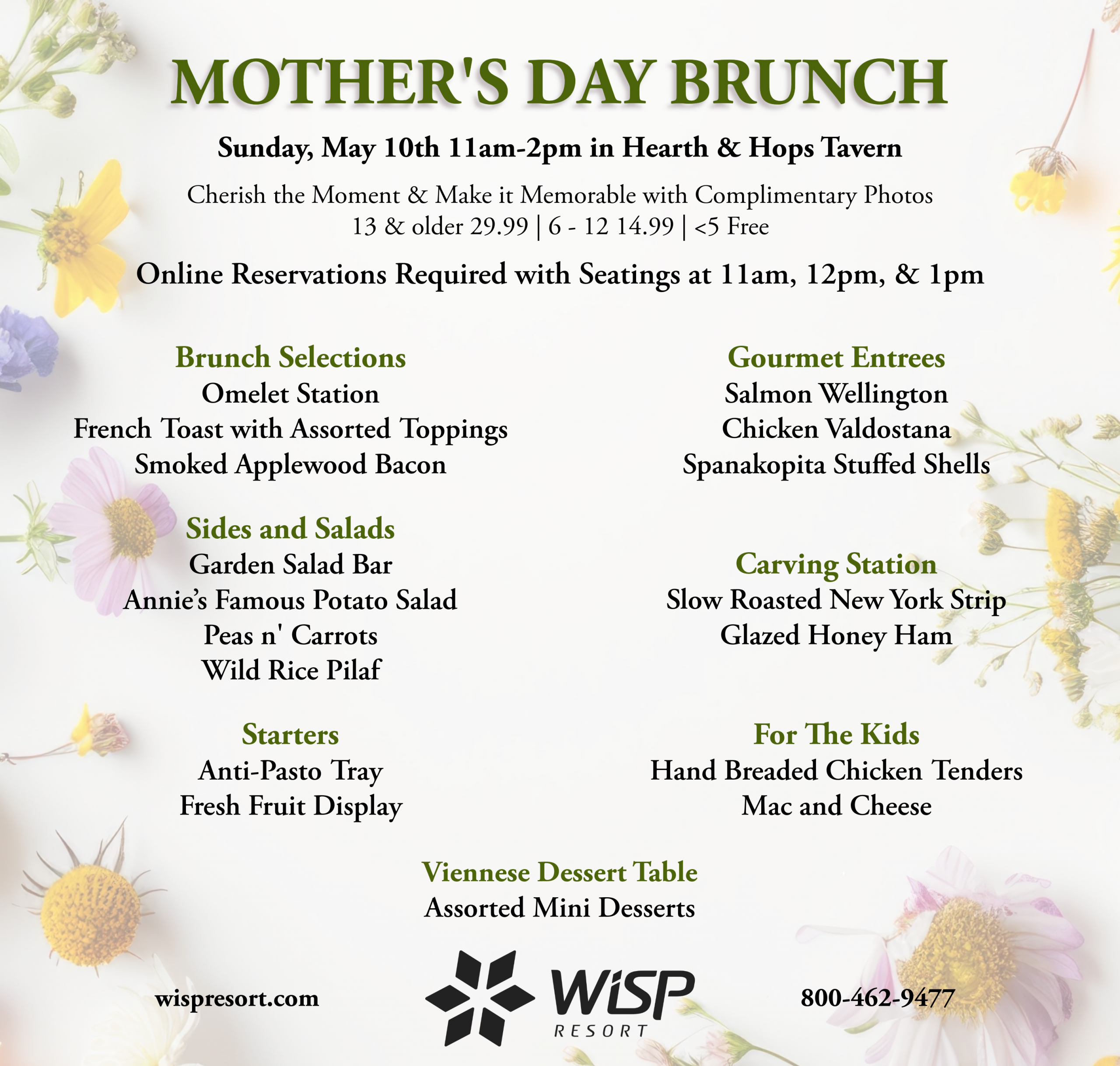 Celebrate Mother’s Day at Wisp Resort in Hearth & Hops Tavern with a delicious buffet and complimentary photos for you and your mom! Enjoy a flavorful brunch filled with classic breakfast selections, gourmet lunch entrées, and assorted desserts paired with personal photos and a special gift for Moms. Take in the beauty of the surrounding mountains while celebrating the women who we couldn’t do life without.